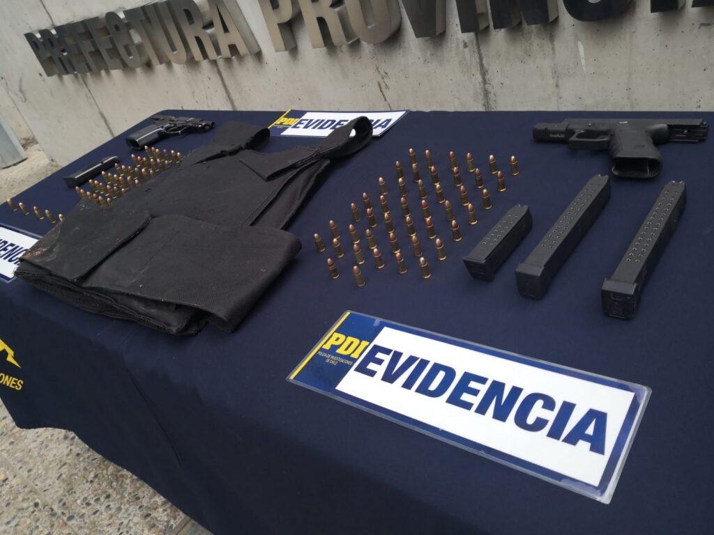 El detenido, al momento de su captura portaba dos armas de fuego, tres cargadores, munición calibre 9 milímetros, un cuchillo y un chaleco antibalas, entre otras especies que serán periciadas por el Laboratorio de Criminalística de la región.
