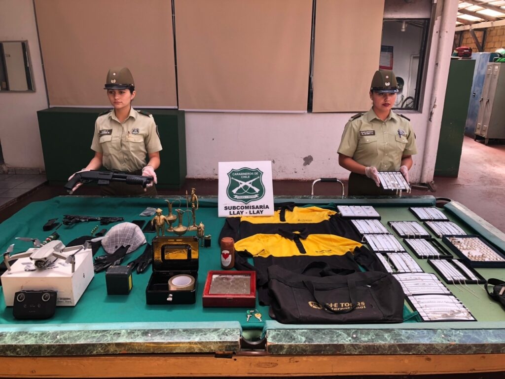 Caracterizados con un furgón de una empresa de reparto, Carabineros de la Subcomisaría Llay Llay detuvieron a tres sujetos con amplios antecedentes delictuales que huían a gran velocidad por la Ruta 5 Norte km. 8 luego de robar mediante la violencia diferentes joyas a una tienda en Pichindangui, recuperando con ello armas y municiones.