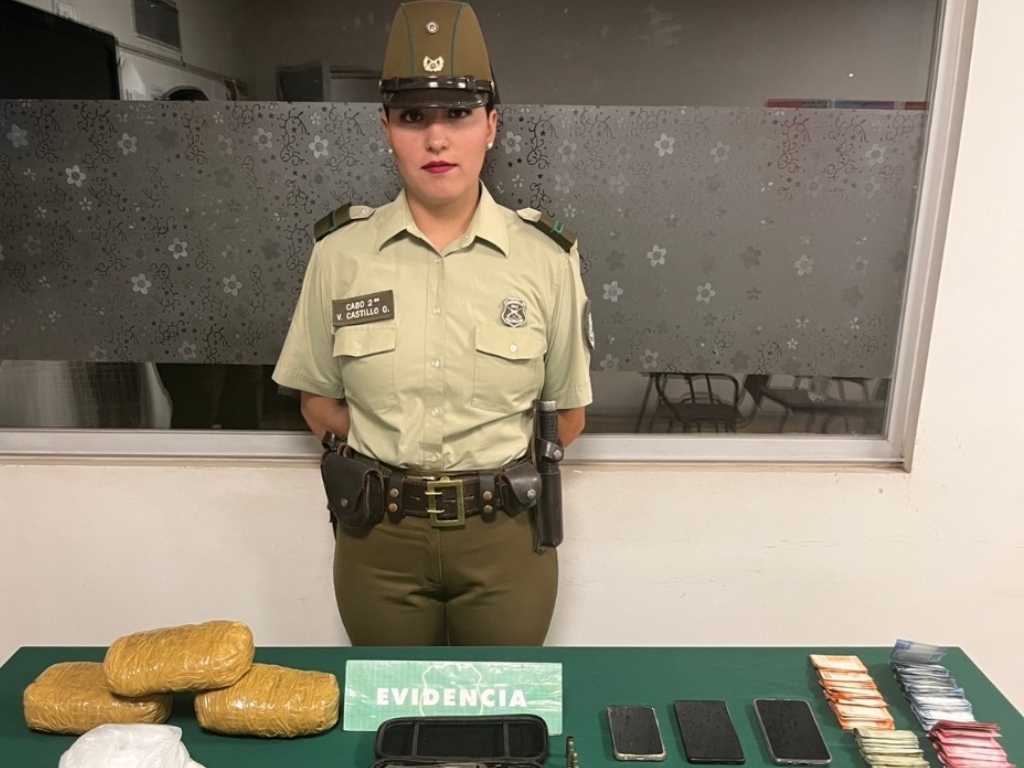 Dos sujetos fueron detenidos por Carabineros tras realizarle un control vehicular por no respetar un signo pare mientras transitaban por La Calera. Allí, el nerviosismo del conductor alertó al funcionario policial y terminó por delatarlo, pues tras una revisión superficial se les encontró droga, un arma, municiones y $1.627.000 en efectivo presumiblemente producto de la venta de las sustancias ilícitas.