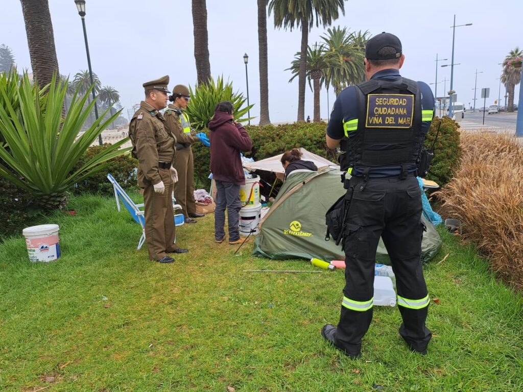Carabineros de la Prefectura Viña del Mar junto a personal Municipal y la Policía Marítima de la Armada de Chile realizaron ayer un operativo conjunto por el borde costero desde Caleta Abarca a Reñaca en el que despejaron cerca de 25 carpas que se encontraban instaladas en el sector tras desarrollar cerca de 40 controles de identidad.